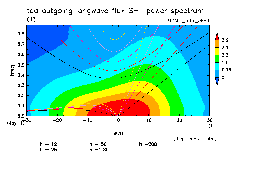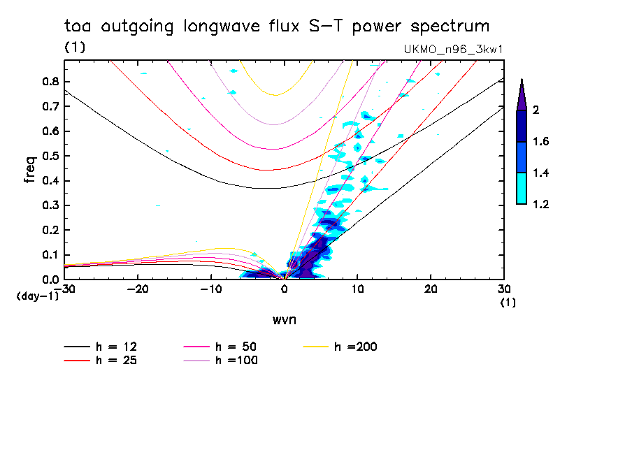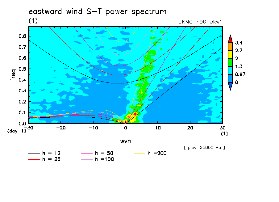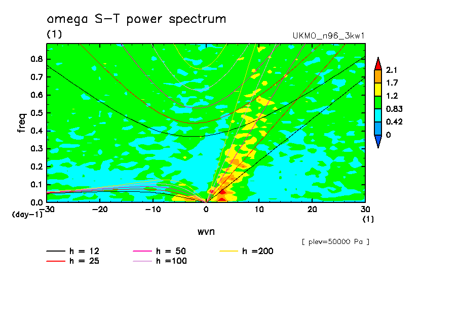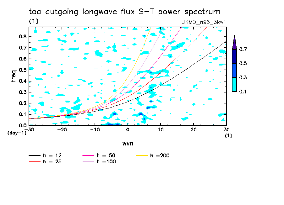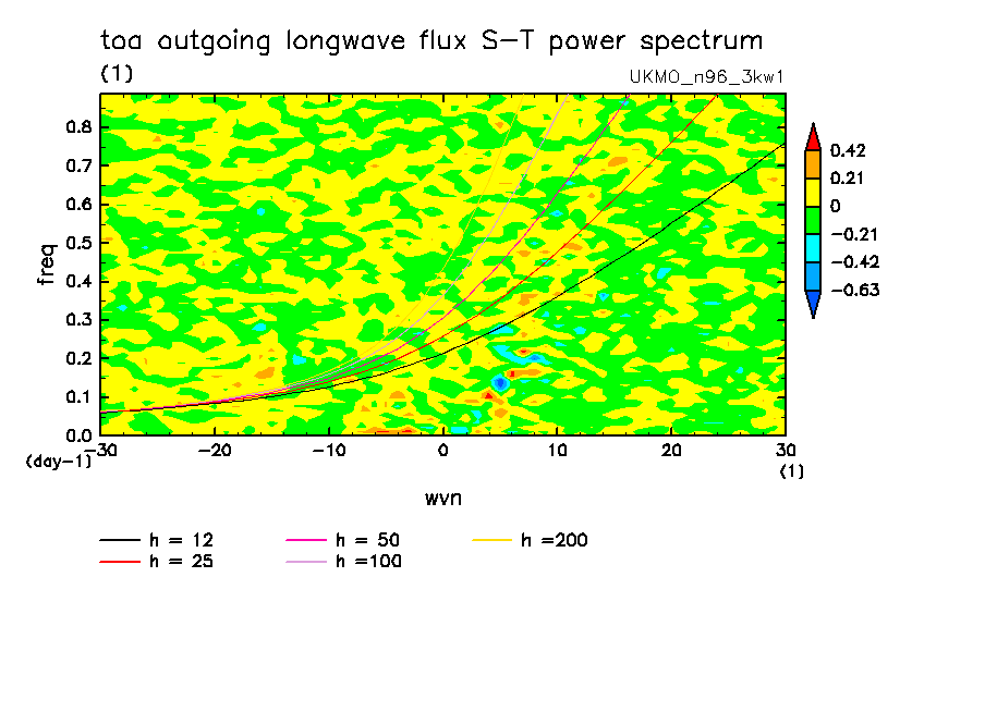 << Aqua Planet: Wheeler and Kiladis (1999) Plot from '3kw1' Experiment >> group: UKMO (United Kingdom Met Office) model: pre-HadGAM1 N96L38