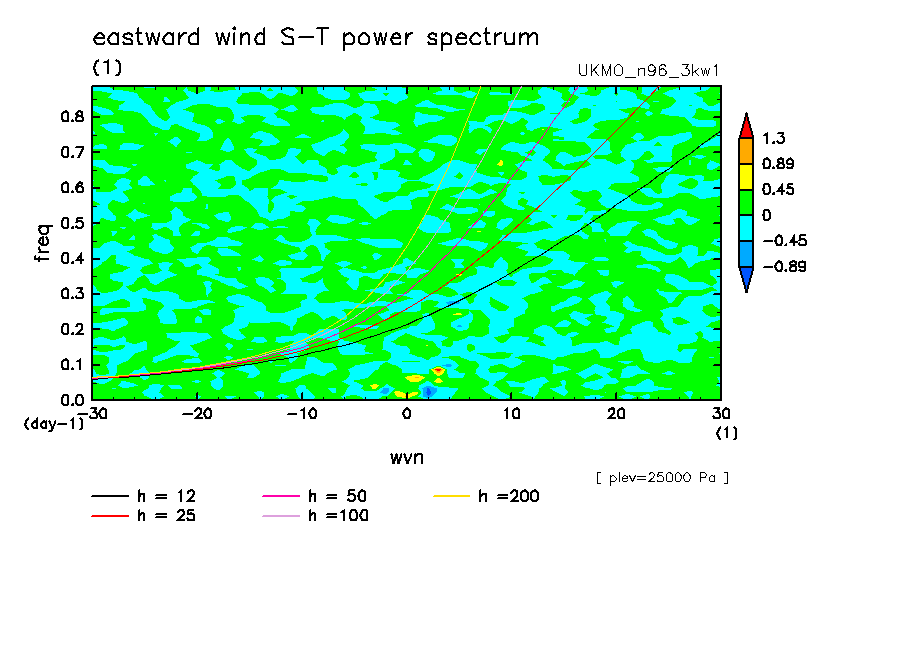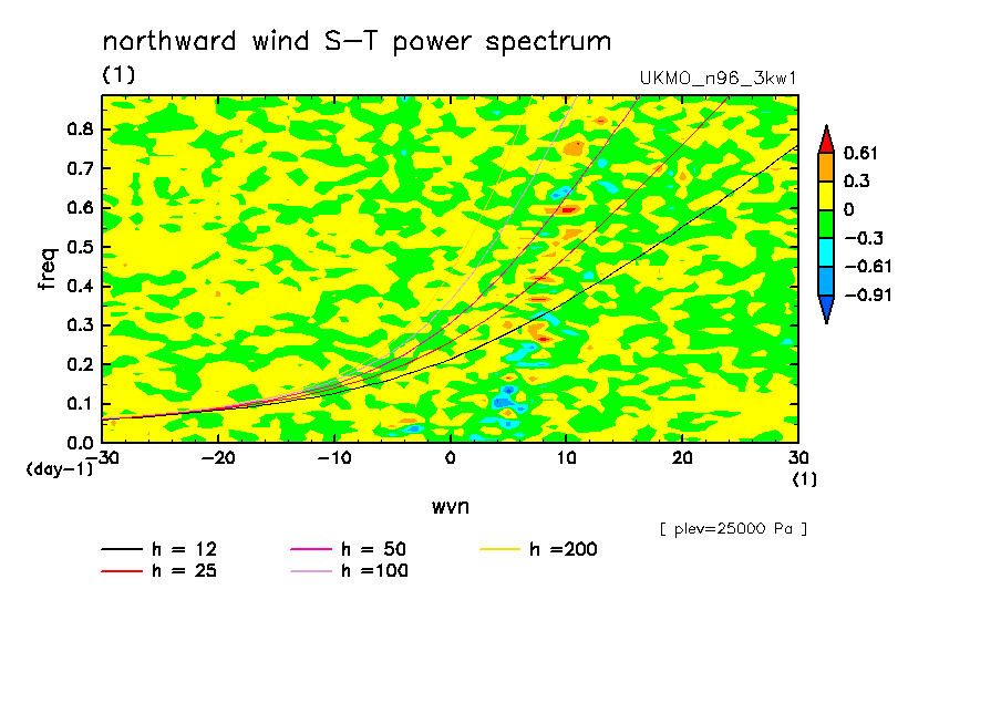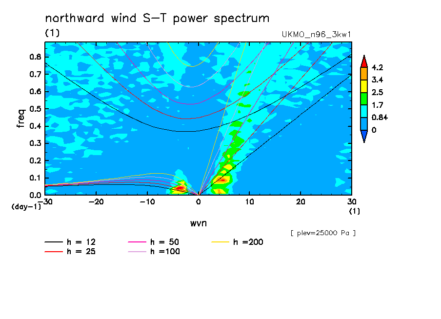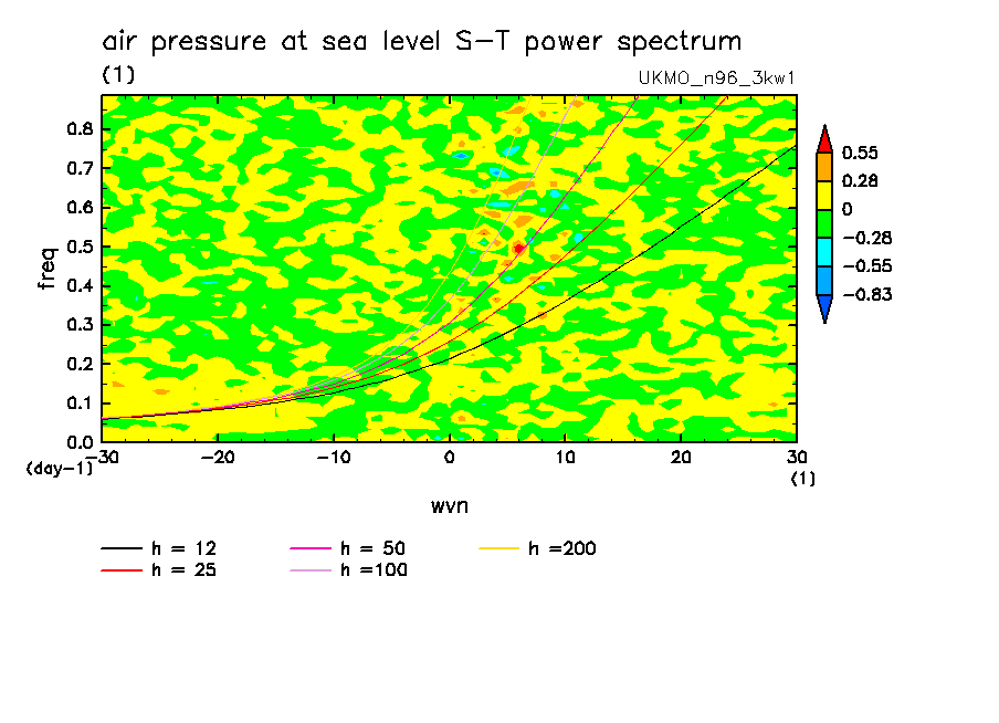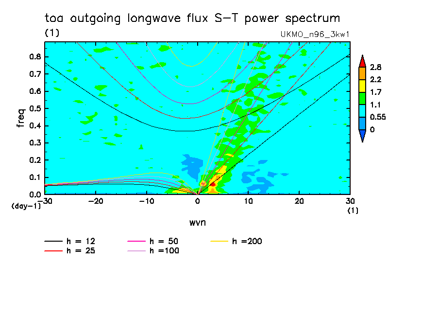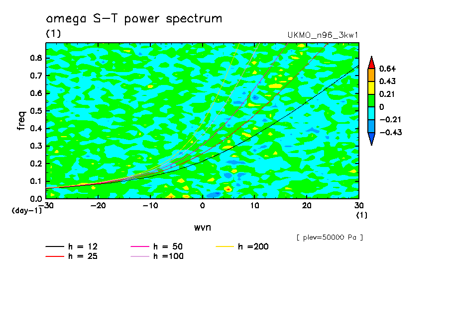 << Aqua Planet: Wheeler and Kiladis (1999) Plot from '3kw1' Experiment >> group: UKMO (United Kingdom Met Office) model: pre-HadGAM1 N96L38