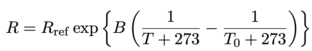 但し, R と Rref はそれぞれサーミスタの抵抗値と基準となる抵抗の抵抗値, B はサーミスタの種類によって決まる定数, T と T0 はそれぞれ温度と基準温度, である. 上式を温度について解けば以下のように書ける.