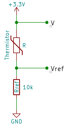 となっている. あとは抵抗値 R の値が計測できれば温度が計算できる. 抵抗値 R を計算するために, 教育ボードでは以下のような回路が組まれており, Vref の値からオームの法則より R が得られるようになっている (図はITOC のチュートリアルより引用).