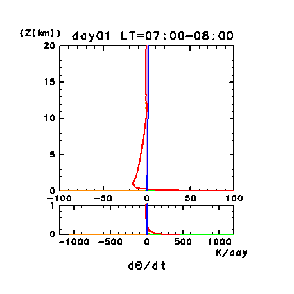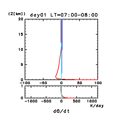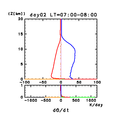 Figure 11g: Horizontal and time mean heating rates for potential temperature; profiles of the second day in the dusty case. Unit is K/day. Orange line denotes convective heating, red line denotes infrared radiative heating, blue line denotes solar radiative heating, green line denotes turbulent diffusion of potential temperature, and light purple line denotes heating due to turbulent dissipation, respectively. Lower panel shows the magnified profiles of the lower altitudes below 1 km height of upper panel. Figure 11h: Diurnal variation of horizontal and time mean radiative heating rates for potential temperature; profiles of the second day in the dusty case. Unit is K/day. Red line denotes infrared radiative heating due to CO2, purple line denotes infrared radiative heating due to dust, blue line denotes near infrared radiative heating due to CO2, and light blue line denotes solar radiative heating due to dust, respectively. Lower panel shows the magnified profiles of the lower altitudes below 1 km height of upper panel.
