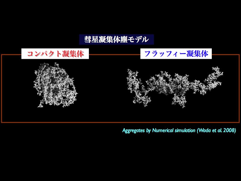 また彗星核に対する理論研究も数多く行われおり、テンペル1の表層では容易にダストマントル層が形成されること、また昇華過程によって相当量始原物質が失われており、深さ数100mまで水氷の結晶化が起こりえるという結果が報告されています [15, 16]。これらの理論研究の結果も彗星標準モデルと調和的です。凝集体塵モデルによる検証