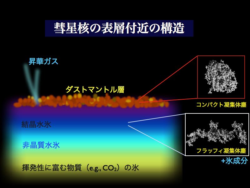 しかし、ダストマントル層の存在を示すには、もっと直接的な証拠、つまり彗星核表層と内部を構成する塵の構造や組成(揮発物質の有無など)の違いが実際にあるということを示すことが大事です。