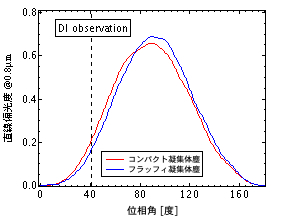次に可視波長0.8μmにおける直線偏光度についての計算結果を右図に示します。このグラフでは、縦軸に直線偏光度、横軸に位相角を取っています。縦波線が実際にDeep Impact探査が行われたときの位相角の位置です。グラフ全体をみると、位相角に対して釣り鐘型の特徴を示すのが分かると分かると思います。実は、この位相角に対する依存性こそ実際に観測される彗星塵の重要な特徴です(逆に言えば、これが満たされない物は、彗星を構成する塵のモデルとして不適切であるとも言えます)。このグラフよりDeep Impactが行われたときの凝集体塵の偏光度は正を示し、コンパクト凝集体塵の方が若干偏光度が高いことがわかると思います。