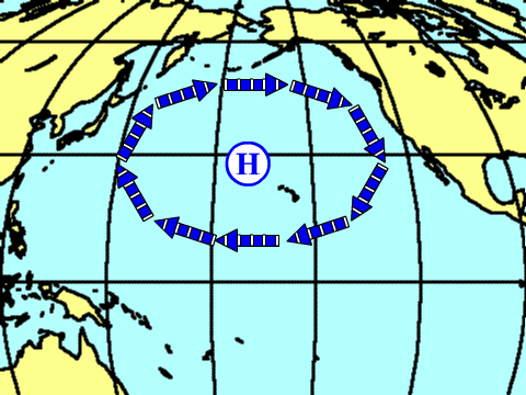 The Pacific high atmospheric pressure zone always sits above the Pacific Ocean, and a wind blows in a clockwise direction. If the sea's water is blown by this wind, then it will