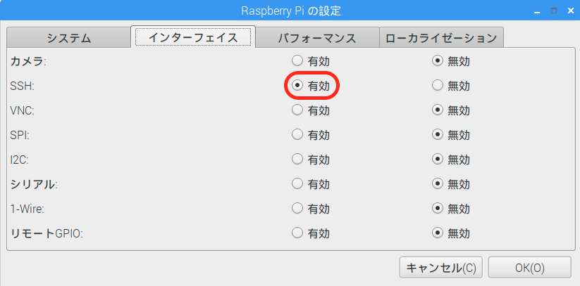 SSH インターフェイスの設定を変更しないと, ラズパイは SSH 接続を受け付けない. "メニュー" => "設定" => "Raspberry Pi の設定" を起動し, "インターフェイス" タブを選択する. 以下のように SSH を「有効」にする.