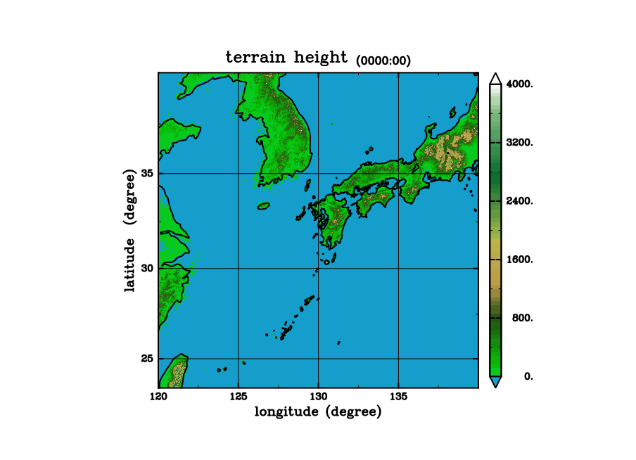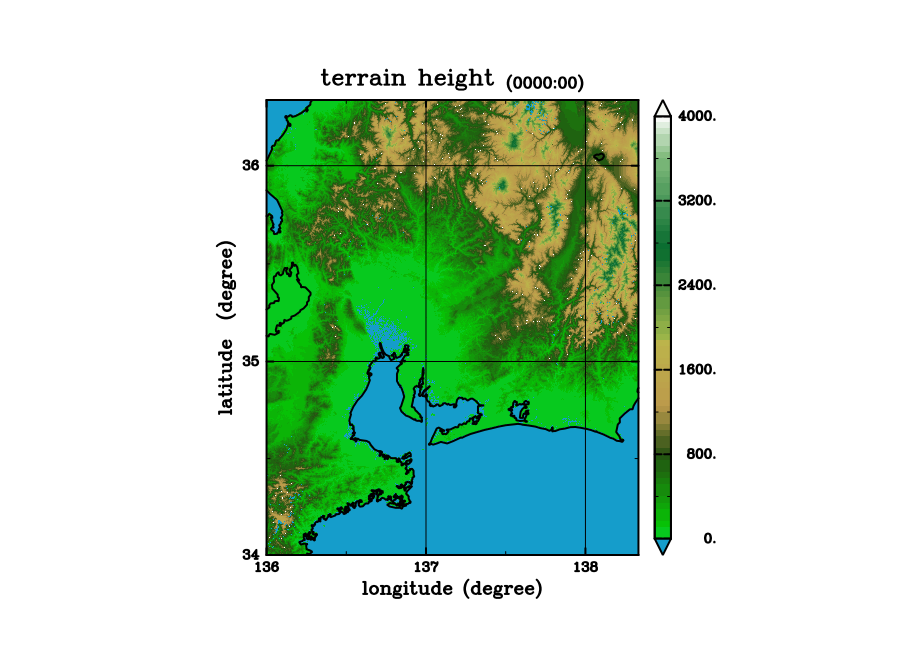 &set ! 結合・描画共通の設定 lonmin = 100 ! 読み込み開始の経度 (西端) latmin = 90 ! 読み込み開始の緯度 (北端) fnumber_lon = 2 ! 経度方向のファイル数 fnumber_lat = 2 ! 緯度方向のファイル数 foot_name = ".DEM" ! 読み込むファイルの拡張子 trn_name = "data.terrain.bin_SRTM30" ! 作成するデータファイルの名前 / &domain ! 描画時のみに使用する設定 (使わない) nnx = 60, 60 ! グラフ化するときの領域 (lonmin からの格子数 x 30 秒) nny = 60, 60 ! グラフ化するときの領域 (latmin からの格子数 x 30 秒) shade_max = 1000.0 ! シェードの最大値 IWS = 1 ! IWS = 1 [x], 2 [ps], 4 [png] 描画結果の出力媒体 /